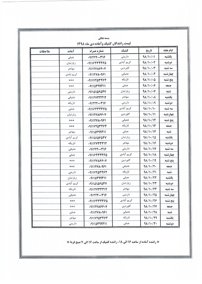تذکر: عدم حضور و قصور در انجام امور محوله بر عهده نیروی خدماتی کشیک می باشد.