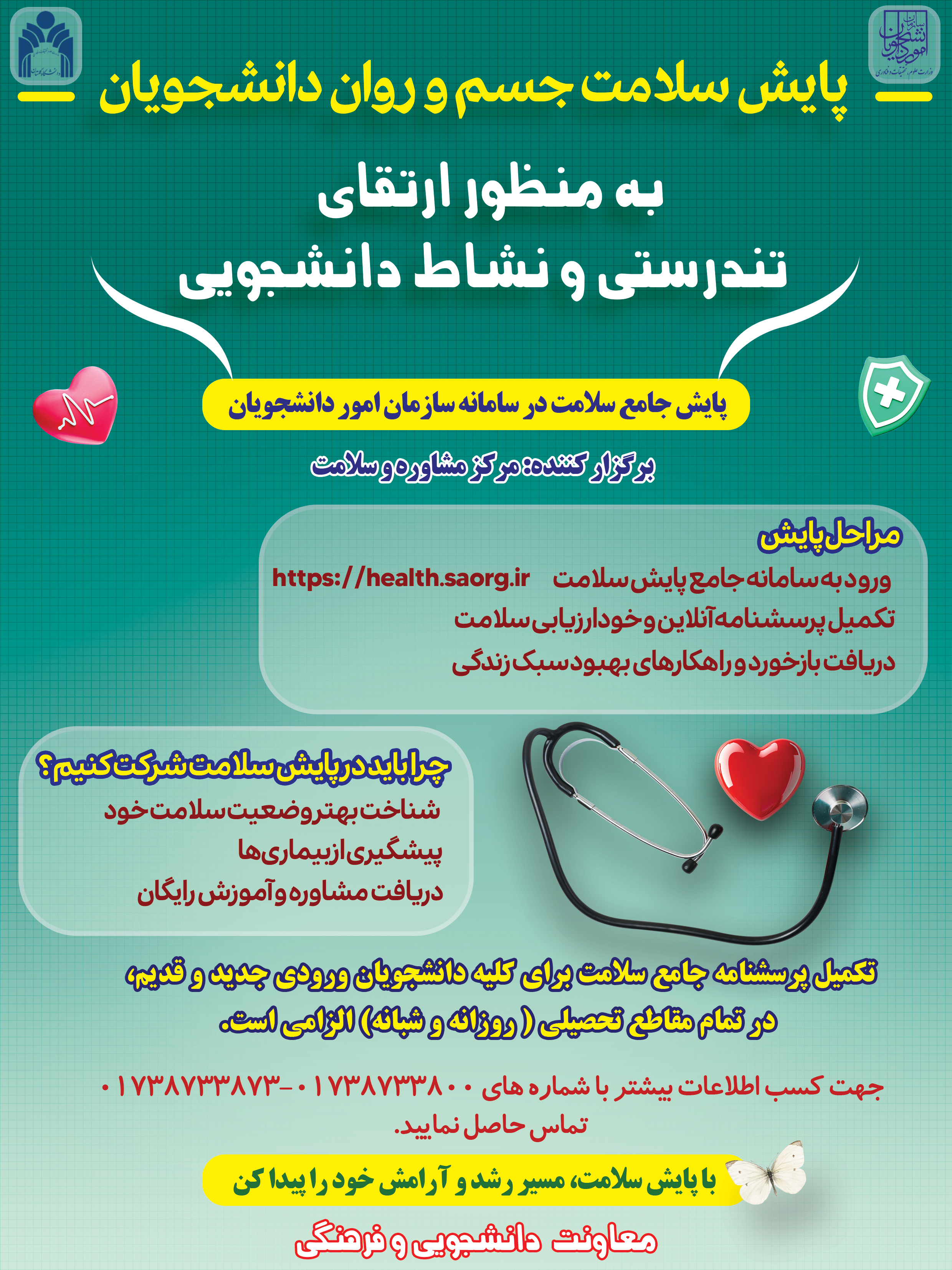 برگزاری طرح جامع پایش سلامت جسم و روان در مرکز مشاوره و سلامت دانشگاه جهت ارتقاء سلامت دانشجویان