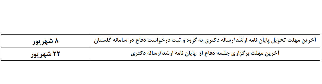 یادآوری تاریخ های مهم برای دفاع توجه: این مهلت ها تمدید نخواهد شد و ثبت درخواست بعد از این مهلت، برای نیمسال بعدی دانشجو محسوب خواهد شد.