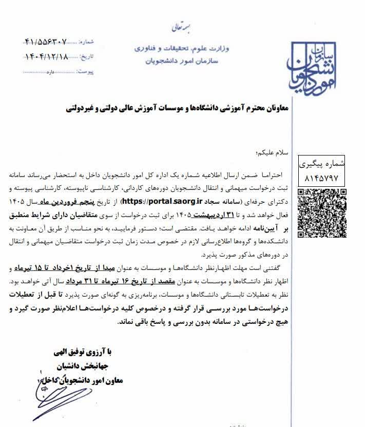 زمان ثبت درخواست میهمانی و انتقال دانشجویان به سایر دانشگاه ها در سامانه سجاد (پنجم فروردین 1405 الی 31 اردیبهشت 1405)